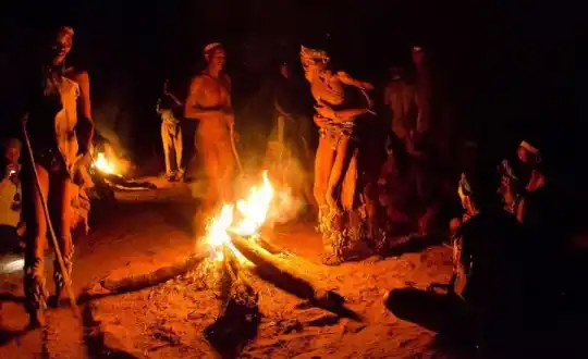 During a girl's puberty ritual, young girl is left alone in her hut at her first periodic discharge of the menses. The elderly women of the tribe perform the Eland Bull Dance by imitating the pairing act of the Eland cows.